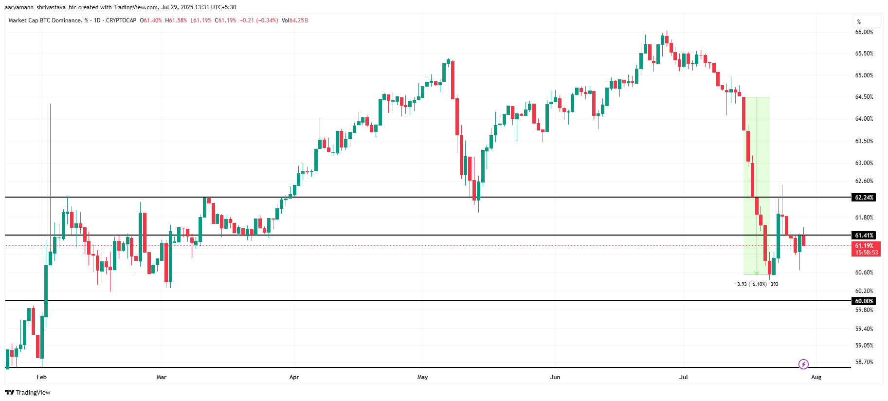การครอบงำของ Bitcoin เพิ่งเริ่มกลับมาเพิ่มขึ้น หลังจากลดลง 6.1% เมื่อต้นเดือนนี้ การลดลงของการครอบงำ Bitcoin ถูกมองว่าเป็นสัญญาณว่า ฤดูกาล altcoin อาจกำลังใกล้เข้ามา
