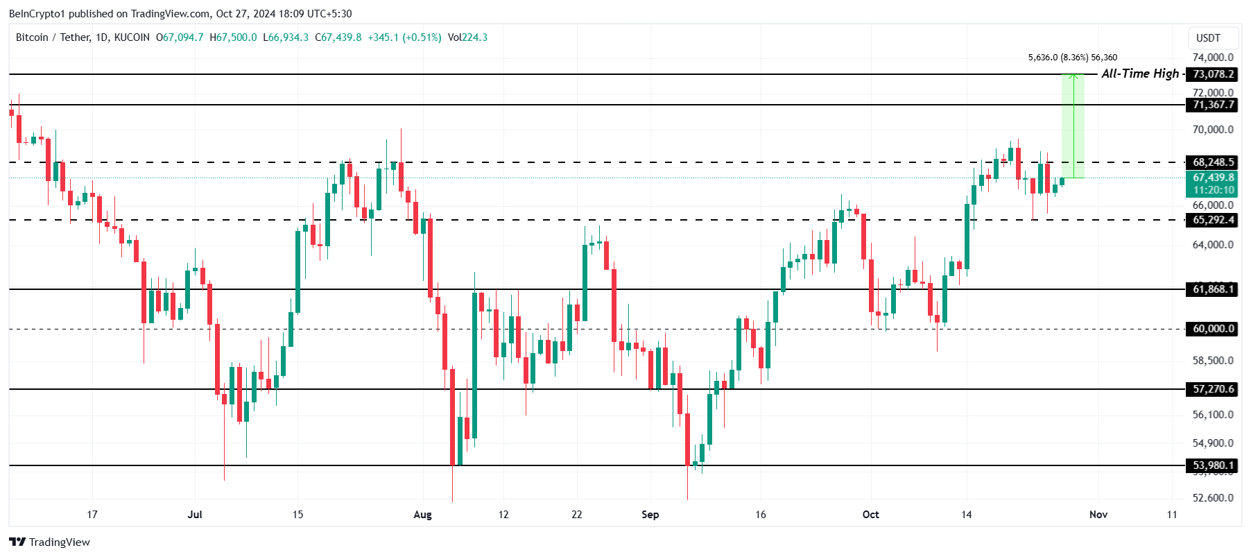 ราคาของ Bitcoin ณ ปัจจุบันอยู่ที่ 67,439 ดอลลาร์ ซึ่งใกล้เข้าถึงระดับสำคัญ 70,000 ดอลลาร์ โดยมีเพียง 8% จาก ATH ที่ 73,078 ดอลลาร์ และ BTC มีศักยภาพที่จะทำลายสถิติใหม่หากแนวโน้มตลาดปัจจุบันยังคงอยู่