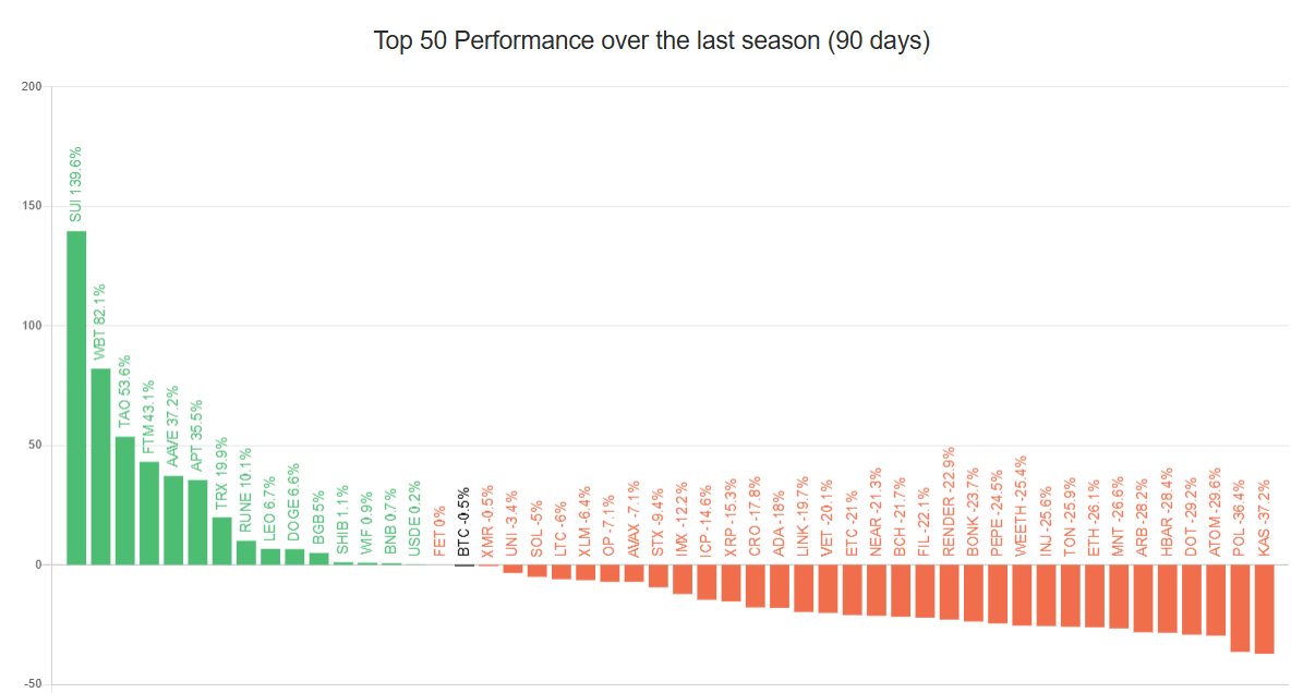 ในปัจจุบัน ฤดูกาลของ altcoin ดูเหมือนจะยังห่างไกล เนื่องจากการเติบโตที่จำกัดของสินทรัพย์ altcoin ให้การยืนยันฤดูกาลของ altcoin ได้ อย่างน้อย 38 altcoins ต้องมีผลการดำเนินงานที่ดีกว่า Bitcoin ในช่วง 90 วัน แต่เพียงเจ็ดเท่านั้นที่ทำได้ในช่วงเวลานี้