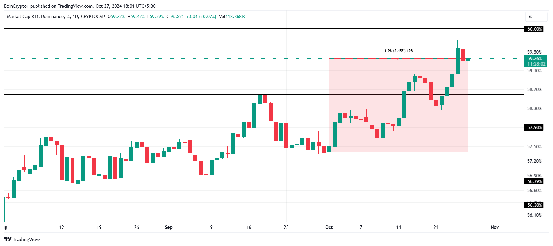 การครองตลาดของ Bitcoin ในตลาด Crypto ยังคงเพิ่มขึ้น โดยเกิน 59% ในเดือนตุลาคม ซึ่งเพิ่มขึ้น 3.45% ตลอดทั้งเดือน การเพิ่มขึ้นนี้เป็นผลมาจากราคาของ Bitcoin ที่เพิ่มขึ้น ทำให้เป็นตัวเลือกการลงทุนที่น่าสนใจ โดยเฉพาะสำหรับผู้เล่นสถาบัน