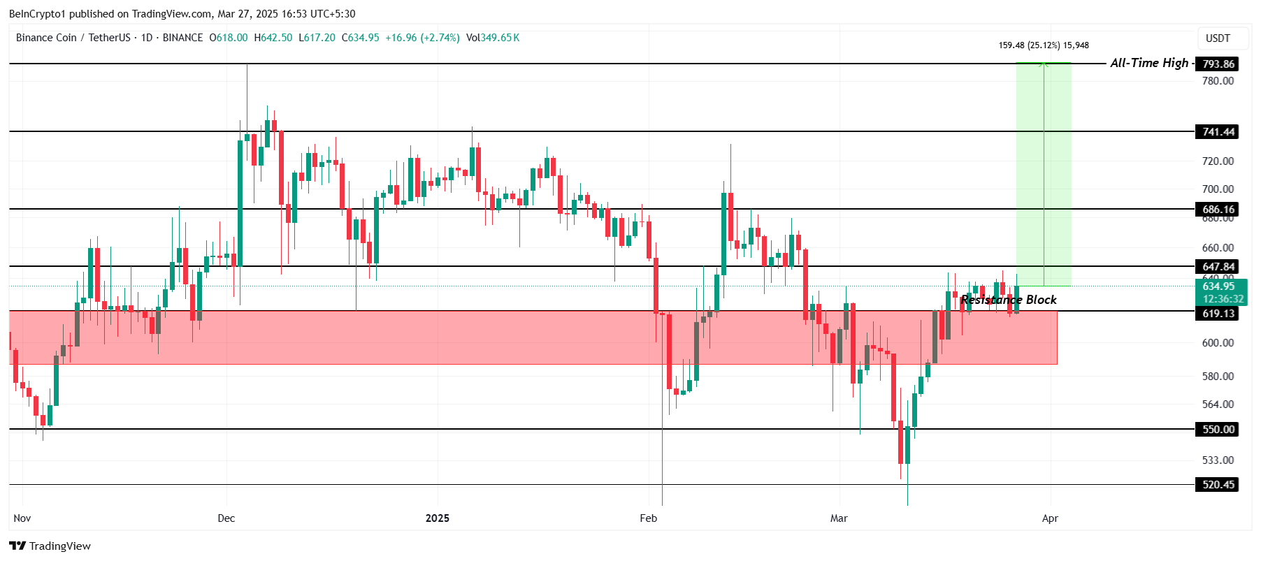 ปัจจุบัน BNB ยังคงอยู่เหนือบล็อกสนับสนุนที่สำคัญระหว่าง $587 และ $619 ซึ่งห่างจาก ATH ประมาณ 25% หากสภาพตลาดโดยรวมกลายเป็นบวก BNB อาจพร้อมที่จะพยายามทำ ATH ใหม่ภายในเดือนหน้า
