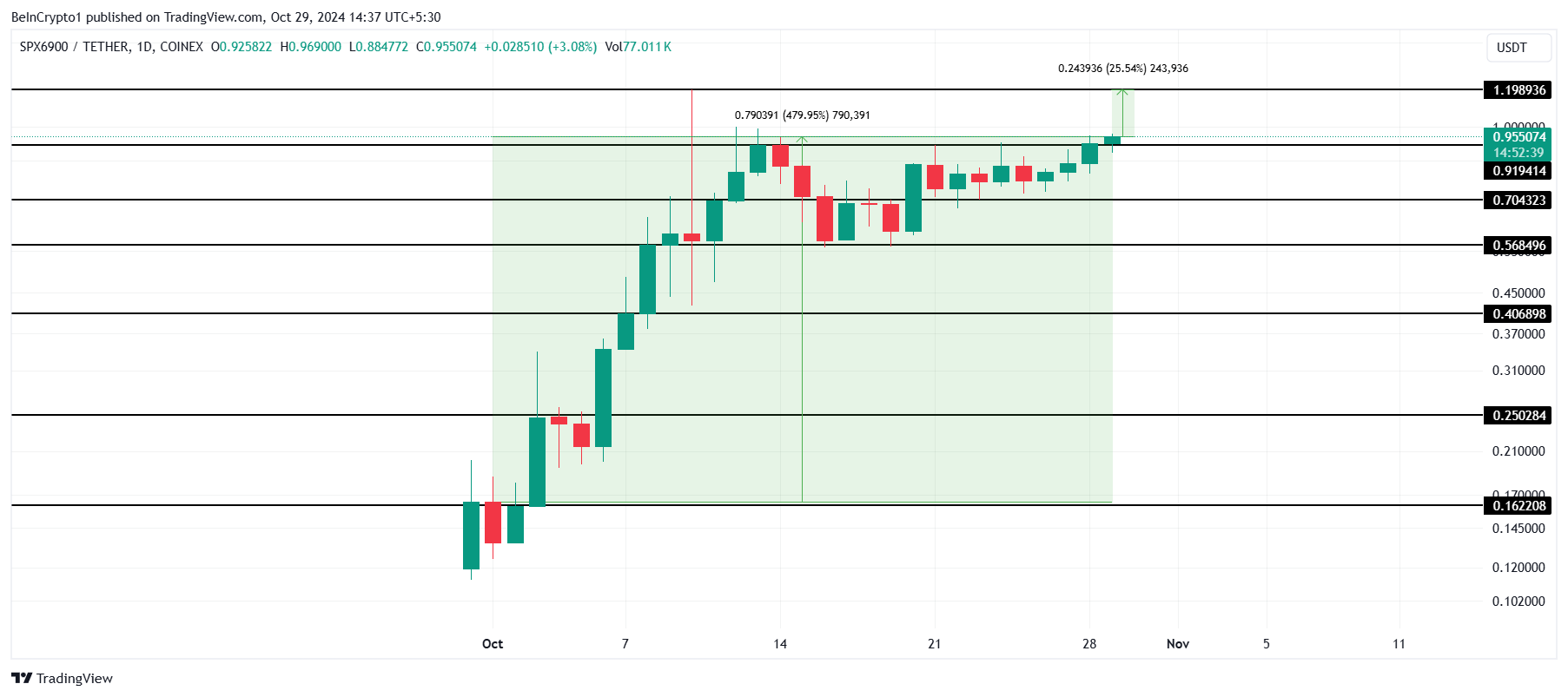 SPX ได้รับความสนใจในตลาด memecoin โดยมีการเพิ่มขึ้นอย่างน่าประทับใจ 479% ตั้งแต่เดือนตุลาคม การพุ่งขึ้นอย่างน่าทึ่งนี้ได้ผลักดัน SPX ไปสู่ระดับสูงสุดตลอดกาลที่ 1.19 USD แสดงถึงความสนใจและแรงผลักดันจากนักลงทุนอย่างมาก