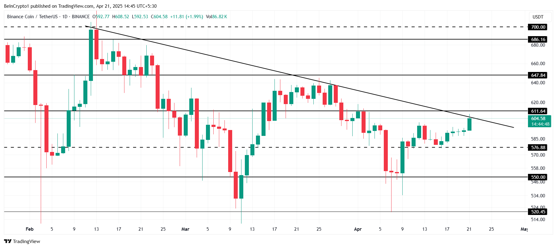 ราคาของ BNB ปัจจุบันอยู่ที่ USD 604 โดยมีแนวโน้มลดลงสองเดือน altcoin กำลังพยายามทะลุแนวต้านที่ USD 611 เพื่อผ่านอุปสรรคนี้ BNB ต้องการการสนับสนุนที่แข็งแกร่งจากตลาดที่กว้างขึ้นหรือการพัฒนาที่กำลังจะเกิดขึ้นซึ่งอาจเป็นตัวกระตุ้นการเคลื่อนไหวและการกลับตัวของราคา