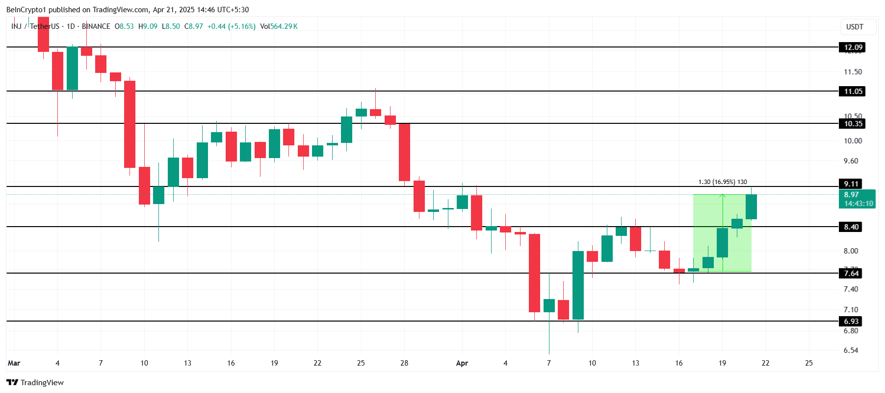 ราคาของ Injective ได้เพิ่มขึ้น 17% ในช่วงไม่กี่วันที่ผ่านมา เนื่องจากความคาดหวังเกี่ยวกับการอัปเกรด Lyota Mainnet ที่จะเกิดขึ้น การอัปเกรดนี้จะเริ่มใช้งานในวันที่ 22 เมษายน คาดว่าจะปรับปรุงโครงสร้างพื้นฐาน ประสิทธิภาพ และความเร็วในการทำธุรกรรมของ Injective สิ่งนี้ได้จุดประกายความหวังและผลักดันราคาให้สูงขึ้นในระยะสั้น
