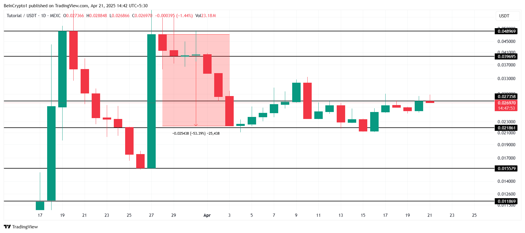 ราคาของ TUT ยังคงเสถียรตลอดทั้งเดือน ปัจจุบันอยู่ต่ำกว่าระดับต้านทานที่ USD0.027 การทะลุผ่านอุปสรรคนี้สำคัญต่อการฟื้นตัวจากการขาดทุน 53% ในเดือนมีนาคม การเพิ่มขึ้นของราคาที่สูงกว่า USD0.027 อาจบ่งชี้ถึงแนวโน้มที่ดีและการเคลื่อนไหวขึ้นในสัปดาห์ต่อไป