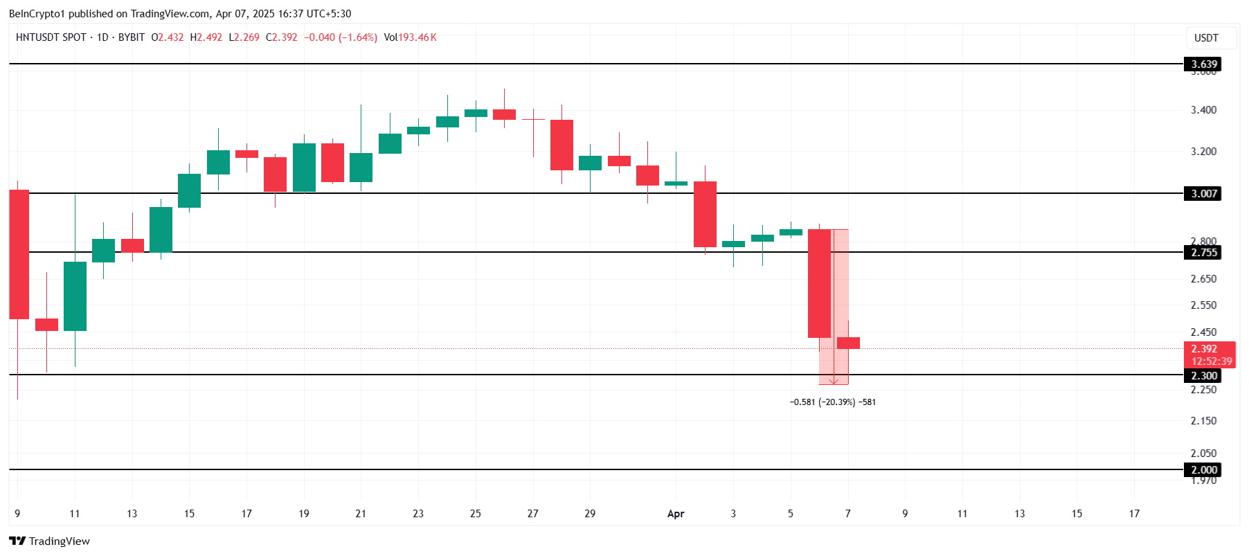 ราคาของ Helium ลดลง ผ่านการสนับสนุนที่ USD 2.30 ในช่วงเช้า ลดลงเกือบ 20% ก่อนที่จะฟื้นตัวเล็กน้อย ปัจจุบันซื้อขายที่ USD 2.39 altcoin นี้แสดงความยืดหยุ่นบางอย่าง อย่างไรก็ตาม สัญญาณขาลงที่กว้างขึ้นยังคงเป็นภัยคุกคามต่อราคาของ HNT ทำให้ผู้ค้ารู้สึกไม่แน่ใจในทิศทางทันทีของมัน