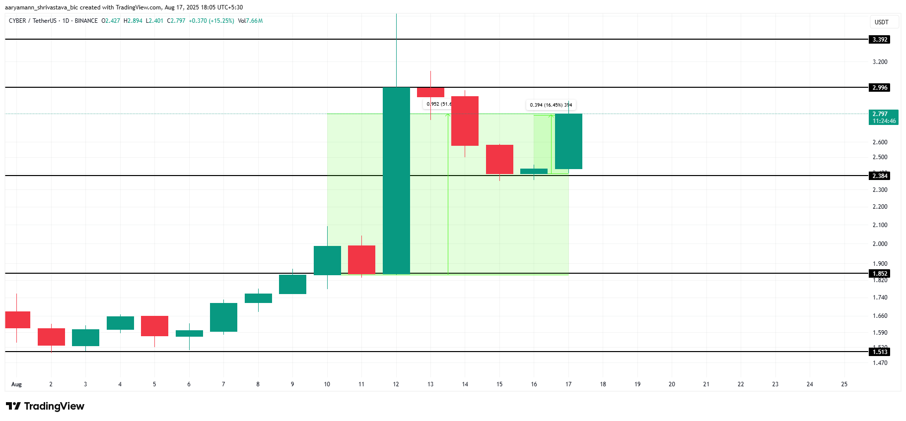 ราคาของ CYBER โดดเด่นในสัปดาห์นี้ โดยได้รับแรงหนุนจากการจดทะเบียนใน Upbit Korea เมื่อวันที่ 12 สิงหาคม การพัฒนานี้กระตุ้นกิจกรรมการซื้อที่แข็งแกร่ง ทำให้โทเคนบันทึกกำไร 51% ในช่วงเจ็ดวันที่ผ่านมา