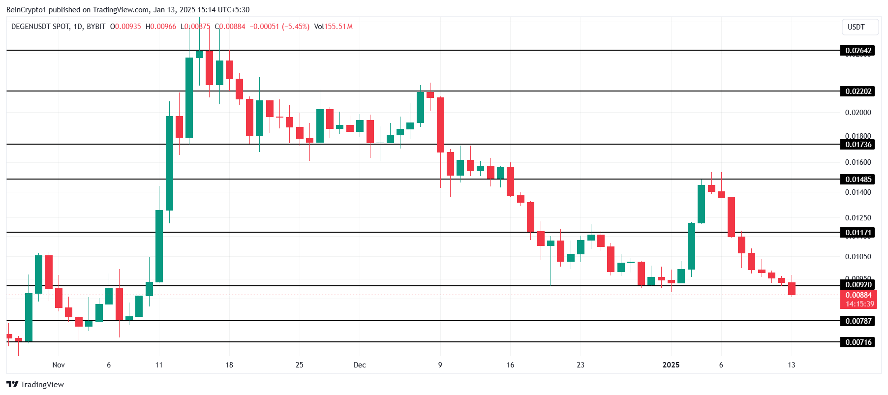 อย่างไรก็ตาม การแจกจ่ายสภาพคล่องที่กำลังจะมาถึงในวันที่ 15 มกราคม อาจดึงดูดความสนใจและเงินทุนอย่างมาก เหตุการณ์นี้มีศักยภาพที่จะพลิกแนวโน้มขาลง ผลักดันราคา DEGEN ไปสู่ USD 0.0117 การทะลุผ่านแนวต้านนี้อาจเปิดทางให้เกิดการฟื้นตัวไปถึง USD 0.0148 ฟื้นฟูความเชื่อมั่นในหมู่นักลงทุนและทำให้เป็น altcoin ที่น่าจับตามอง