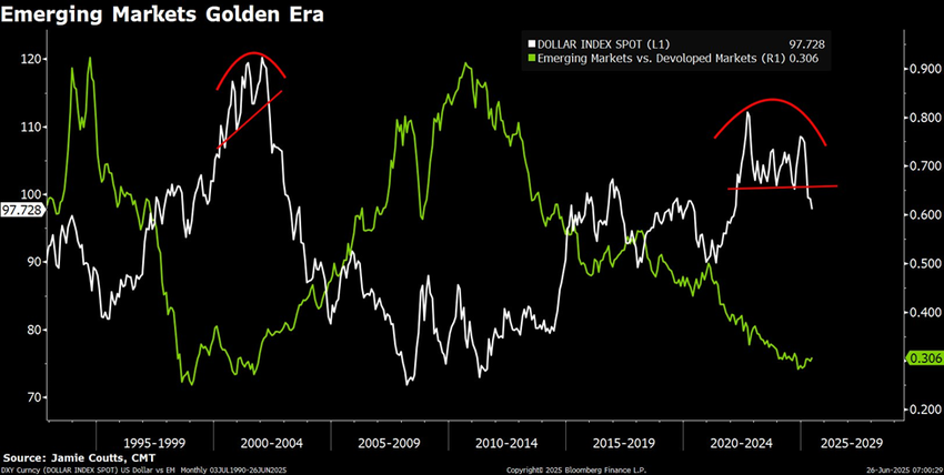 หากคุณจำได้ในช่วงปี 2002–2008 การลดลงของดอลลาร์ครั้งใหญ่ครั้งสุดท้ายได้จุดไฟให้กับหุ้นและสินค้าโภคภัณฑ์ในตลาดเกิดใหม่ ตลาดเกิดใหม่มีผลการดำเนินงานดีกว่าตลาดที่พัฒนาแล้วถึง 3 เท่าเนื่องจากเงินทุนไล่ตามเศรษฐกิจที่เติบโตสูงและอายุน้อย — ทำให้เกิด BRICS คริปโตคือ EM ของวันนี้ เขา กล่าว