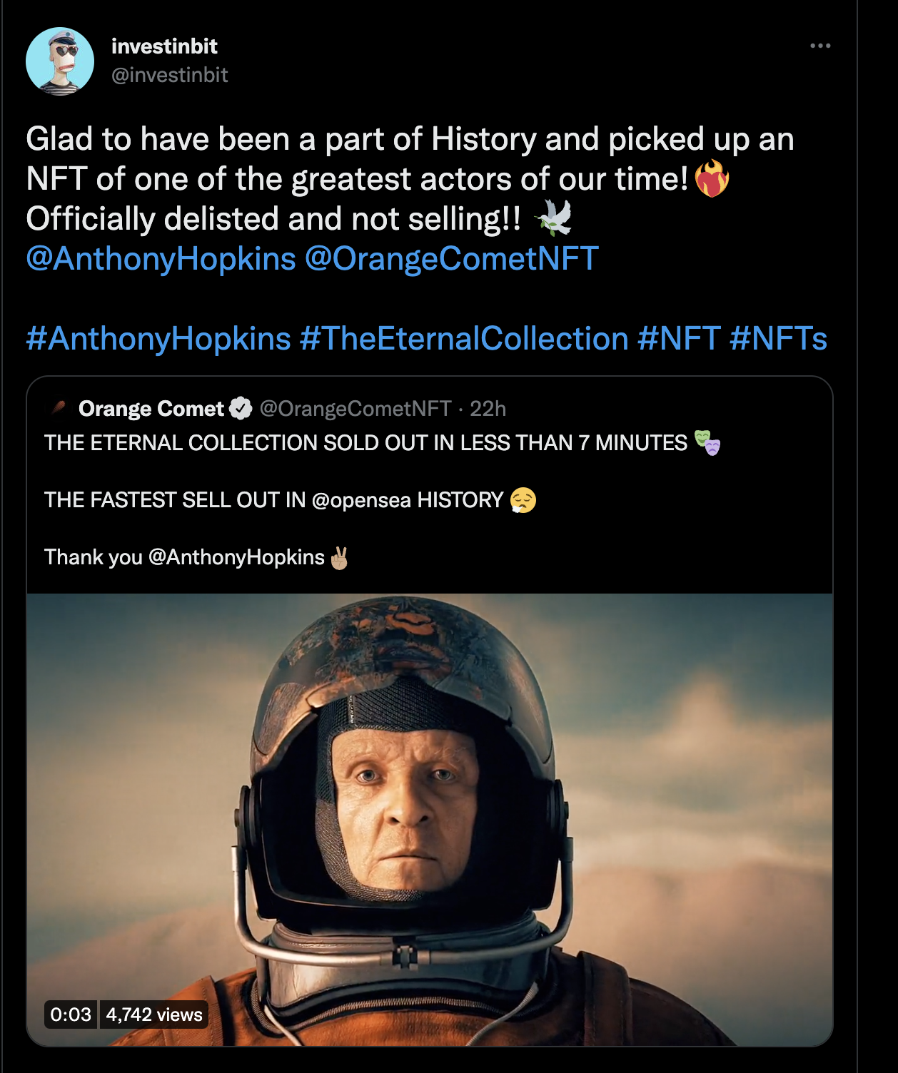 Anthony Hopkins: The Eternal Collection ขายหมดใน 7 นาที ทำลายสถิติคอลเล็กชัน NFT ที่ขายหมดเร็วที่สุดในประวัติศาสตร์ของ OpenSea