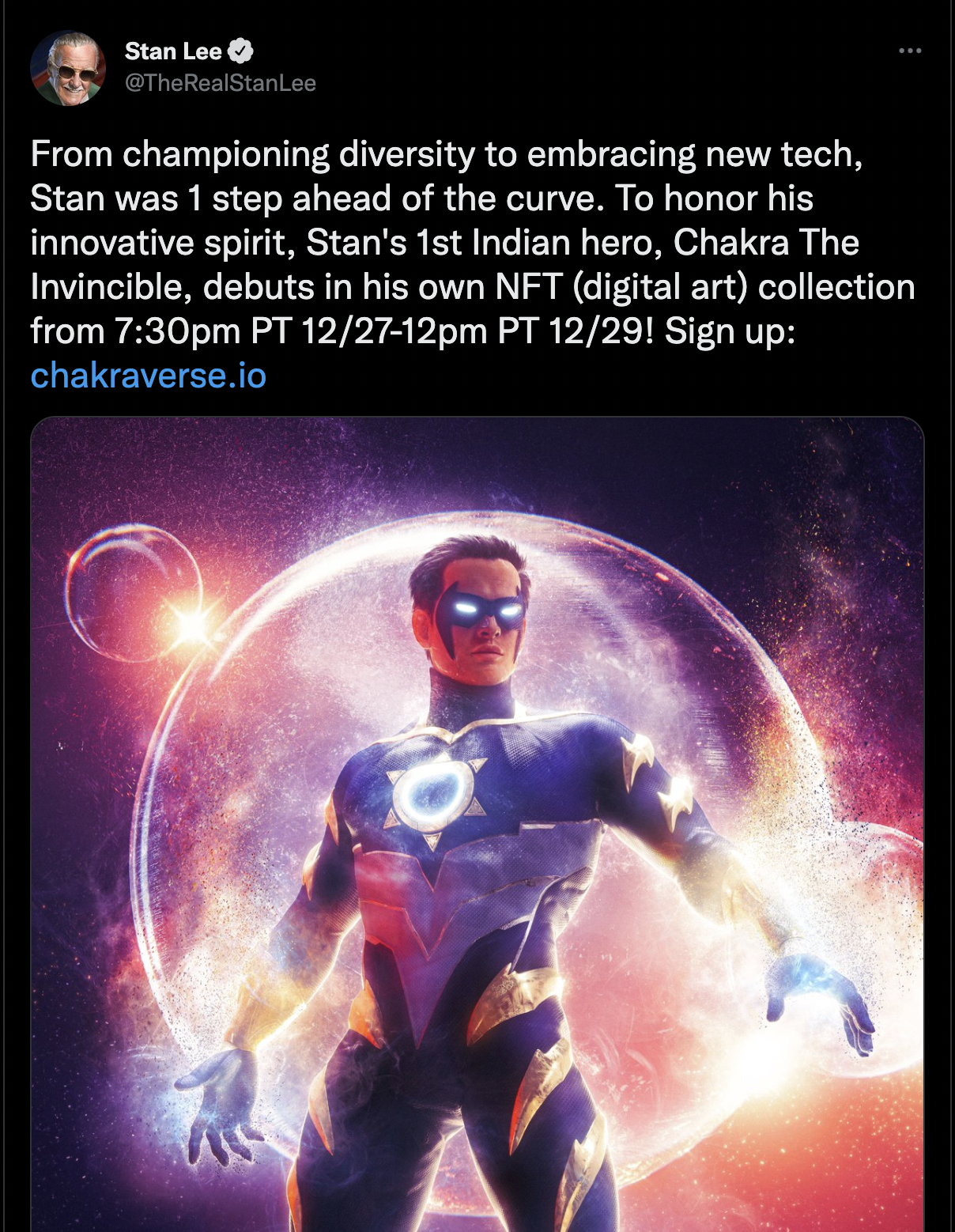 คอลเลกชันที่มีชื่อเสียงที่สุดจาก Orange Comet คือ The Chakra NFT ซึ่งสร้างจากตัวละครการ์ตูน Marvel ที่สร้างโดย Stan Lee บัญชีอย่างเป็นทางการของ Stan Lee ซึ่งขณะนี้ได้ยกย่องผลงานของเขาโพสต์ข้อความบน Twitter เกี่ยวกับการดร็อป Chakra
