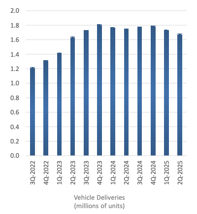 การครองตลาดรถยนต์ไฟฟ้าของบริษัทแสดงสัญญาณการลดลง โดยมีส่วนแบ่งตลาดอยู่ที่ 46.2% ขณะที่ GM กำลังปิดช่องว่างอย่างรวดเร็ว เพิ่มขึ้นจาก 10.8% เป็น 14.9% รายไตรมาส รายได้หลักจากรถยนต์ของ Tesla ลดลง 16% เหลือ 16.66 พันล้าน USD แสดงถึง อุปสรรคเชิงโครงสร้าง ที่ขยายเกินกว่ารูปแบบวัฏจักรทั่วไป