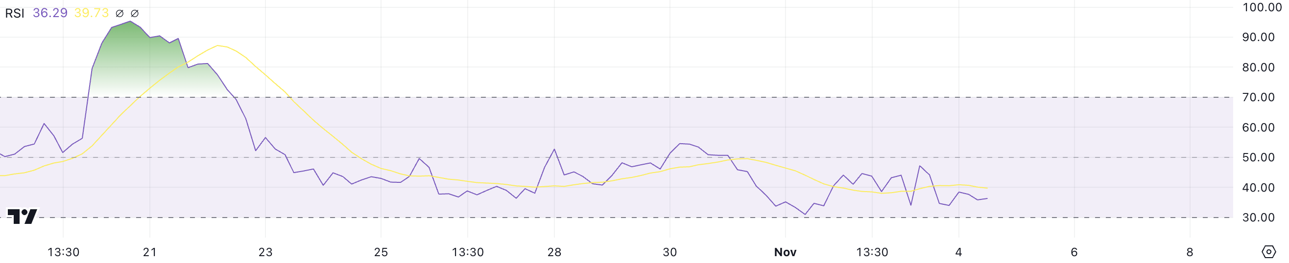 ดัชนี RSI ของ APE ปัจจุบันอยู่ที่ 36.29 ซึ่งบ่งชี้ระดับแรงผลักดันที่ค่อนข้างต่ำและส่งสัญญาณว่าแรงขายเป็นฝ่ายครอง ดัชนี RSI หรือ Relative Strength Index เป็นตัวชี้วัดที่ใช้ประเมินว่าสินทรัพย์ถูกซื้อมากเกินไปหรือขายมากเกินไป