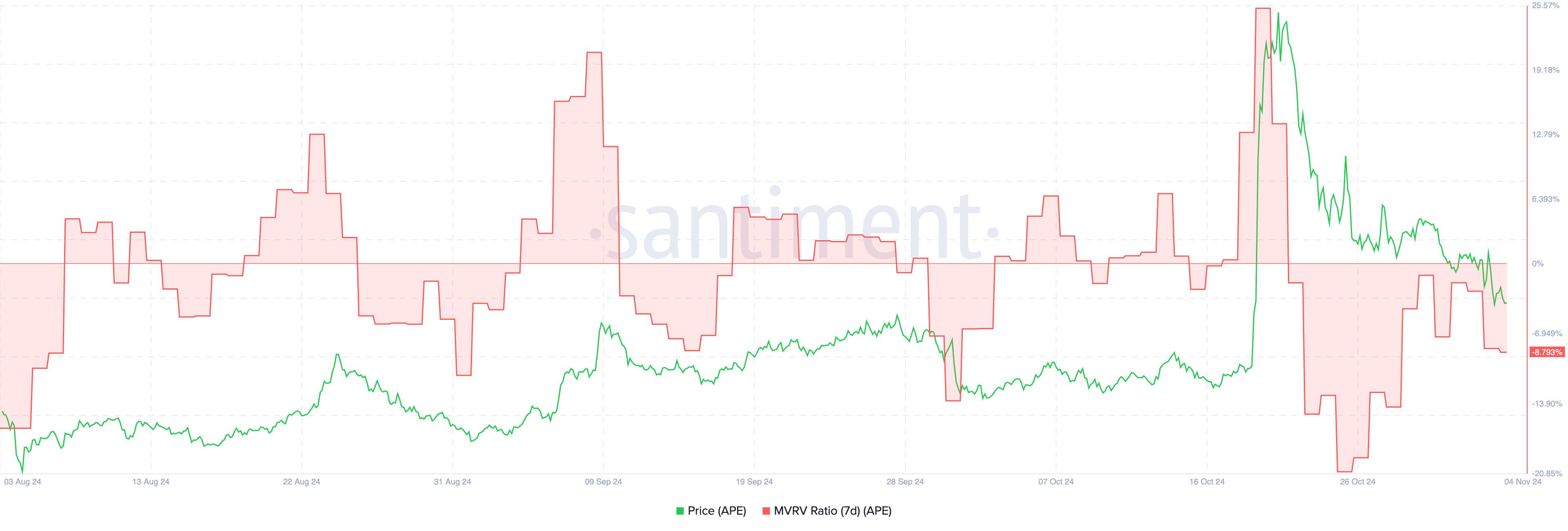ดัชนี MVRV 7 วันของ APE ปัจจุบันอยู่ที่ -8.79% ซึ่งบ่งชี้ว่าผู้ถือส่วนใหญ่ที่ซื้อในสัปดาห์ที่ผ่านมาขาดทุน ดัชนี MVRV ที่ติดลบโดยทั่วไปบ่งชี้ว่าสินทรัพย์มีการประเมินมูลค่าต่ำ เนื่องจากผู้ถือส่วนใหญ่ขาดทุน ซึ่งบางครั้งนำไปสู่การฟื้นตัวของราคาเมื่อแรงขายลดลง