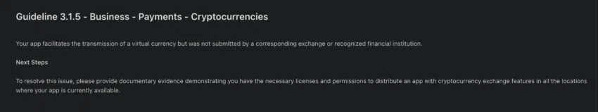 Apple ให้เหตุผลว่า “แอ็ปดังกล่าวอำนวยความสะดวกในการโอนเงินดิจิทัลจริง แต่ไม่ได้โอนโดยแพลตฟอร์มคริปโตหรือสถาบันการเงินที่เป็นที่ยอมรับ”
