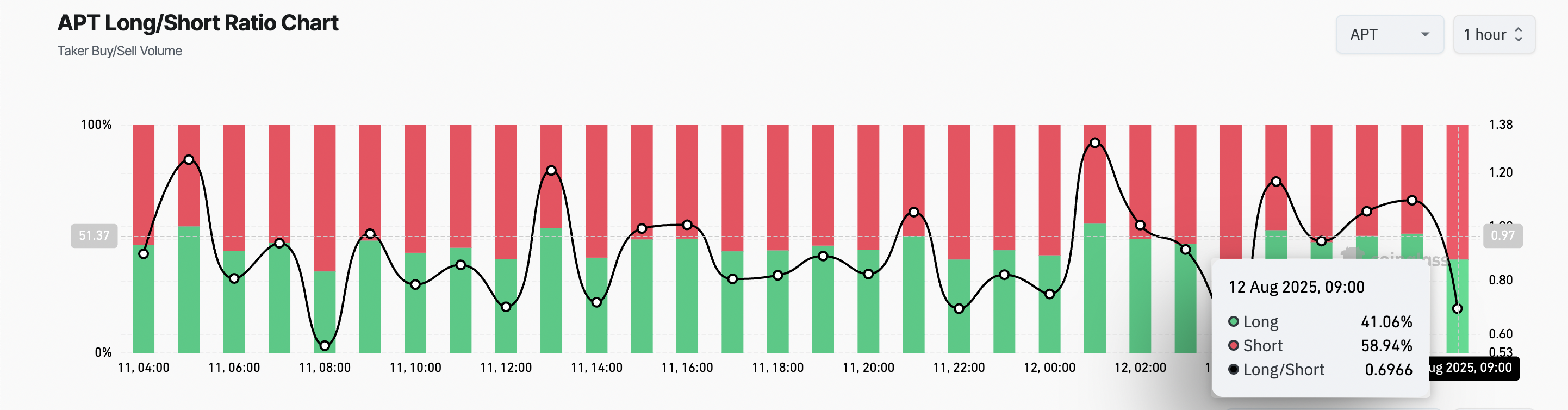 อัตราส่วน long/short ของ APT บ่งชี้ถึงความต้องการที่เพิ่มขึ้นสำหรับตำแหน่ง short เนื่องจากนักเทรดกำลังวางตำแหน่งตนเองเพื่อใช้ประโยชน์จากแรงกดดันขาลงที่เพิ่มขึ้น