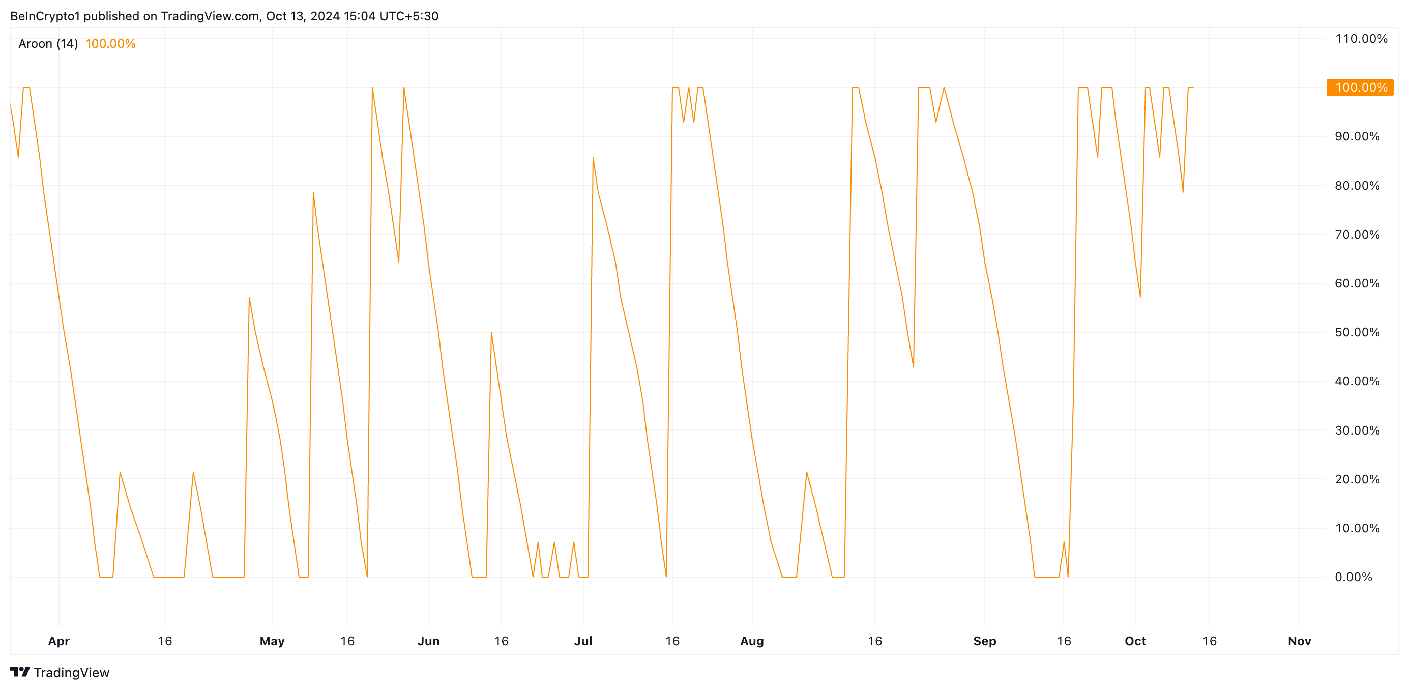 การอ่าน Aroon 100% ถือเป็นสัญญาณที่แข็งแกร่งของการเคลื่อนไหวขาขึ้น แสดงถึงแรงผลักดันที่แข็งแกร่ง ผู้ค้ามองว่านี่เป็นการยืนยันของแนวโน้มขาขึ้น บ่งบอกว่าผู้ซื้อมีอำนาจควบคุมและราคาน่าจะยังคงเพิ่มขึ้นในระยะใกล้