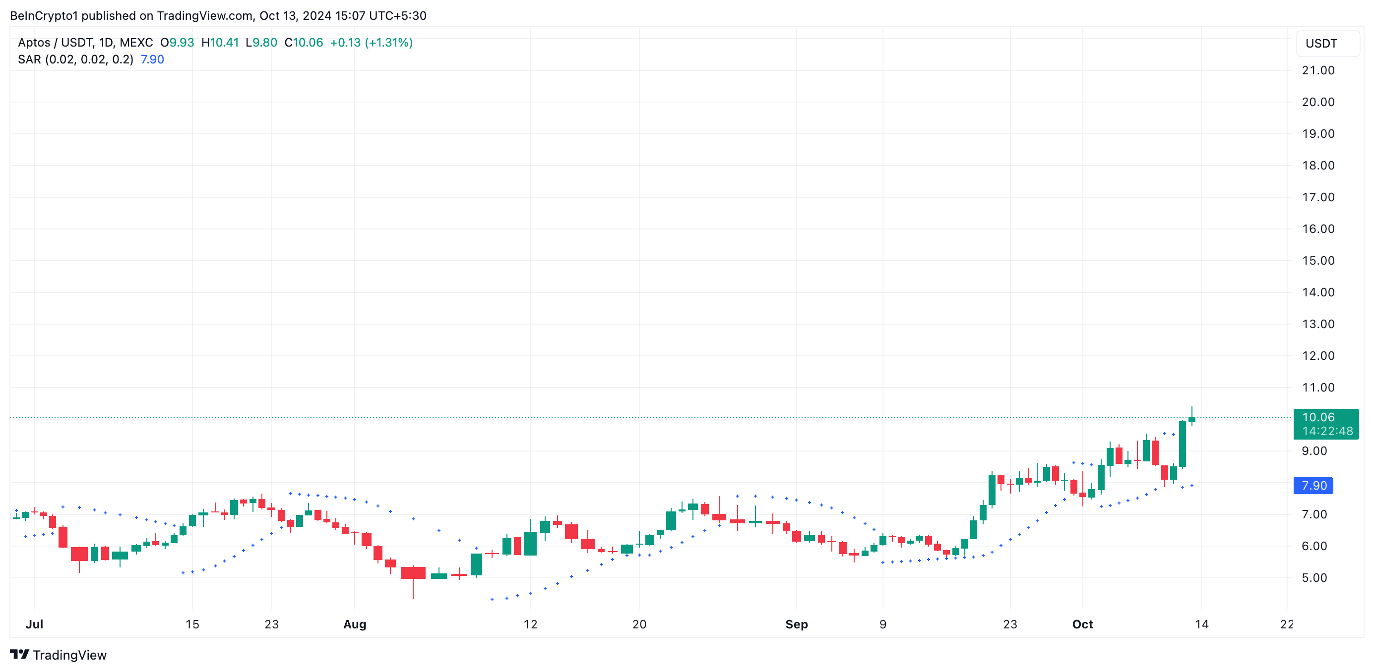 APT Token การกำกับดูแลของเครือข่าย Blockchain Layer-1 อย่าง Aptos ได้พบกับการเพิ่มขึ้น 17% ในช่วง 24 ชั่วโมงที่ผ่านมา ปัจจุบันมีการซื้อขายที่ราคา 10.05 ดอลลาร์ ทำให้เป็นผู้ที่มีผลการดำเนินงานดีที่สุดในหมู่ 100 สกุลเงินดิจิทัลที่มีมูลค่าตลาดสูงสุดในช่วงเวลานั้น