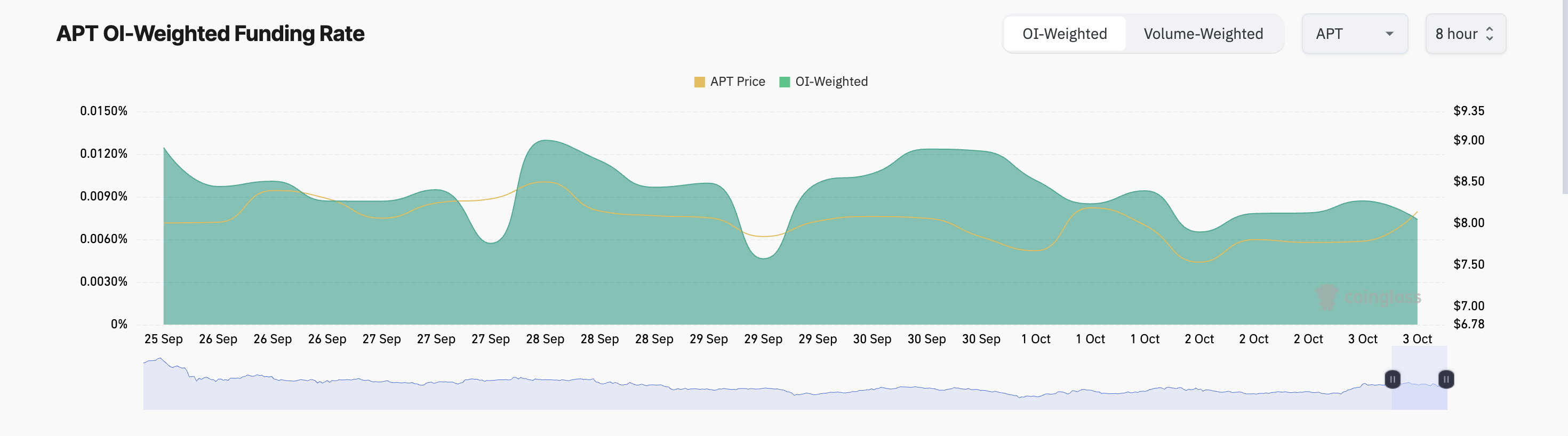 อัตราการเงินทุนบวกของ APT ที่ 0.0074% สนับสนุนมุมมองเชิงบวกนี้ อัตราการเงินทุนบวกบ่งบอกถึงความรู้สึกเชิงบวกของผู้ค้า มันบ่งชี้ว่าผู้เข้าร่วมมากขึ้นมั่นใจในการเพิ่มขึ้นของราคา ทำให้พวกเขาเลือกที่จะเข้าสู่ตำแหน่งยาว ซึ่งสามารถสร้างแรงกดดันให้ราคาของสินทรัพย์พื้นฐานเพิ่มขึ้น