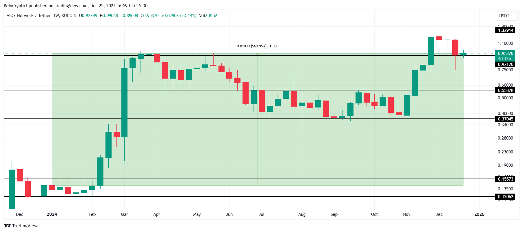 ผลกระทบนี้สามารถสังเกตได้จาก AIOZ Network AIOZ ที่มีการเพิ่มขึ้น 569% ในช่วง 12 เดือนที่ผ่านมา Altcoin นี้สามารถขึ้นไปเกินเกณฑ์ 1.00 ดอลลาร์ ก่อนที่จะลดลงมาอยู่ที่ 0.95 ดอลลาร์ ในขณะนี้