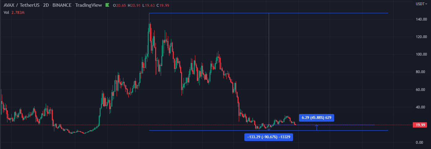 ณ เวลาที่เขียน ราคาเหรียญ AVAX อยู่ที่ 19.80 ดอลลาร์สหรัฐ มีอัตราการเติบโตจากจุดต่ำสุดที่ราคา 13.71 ดอลลาร์เมื่อเดือนมิถุนายนอยู่ราว 45% และร่วงลงจาก All time high เมื่อเดือนพฤศจิกายน 2021 อยู่ราว 86%
