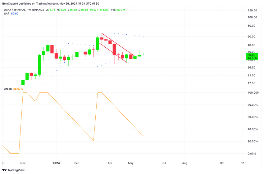 แม้ว่าราคาของ AVAX จะเติบโต ตั้งแต่ทะลุเหนือเส้นบนของช่องจากมากไปน้อย แต่ Aroon Up Line ก็มีแนวโน้มลดลง