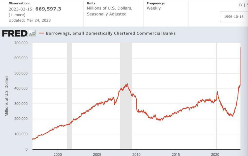 CNN รายงานว่าการกู้ยืมโดยธนาคารขนาดเล็กของสหรัฐฯ แตะระดับสูงสุดนับตั้งแต่ช่วงเปลี่ยนศตวรรษ ตามรายงาน ธนาคารต่างๆ กู้ยืมเงิน 669.6 พันล้านดอลลาร์ในสัปดาห์นี้ แต่นักวิเคราะห์เชื่อว่านี่เป็นเพียงความพยายามของธนาคารเพื่อเตรียมพร้อมสำหรับการดำเนินการของธนาคาร และไม่จำเป็นต้องส่งสัญญาณถึงปัญหาในปัจจุบัน