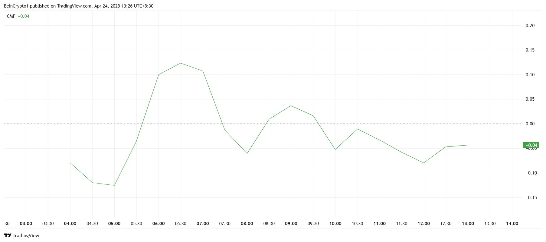 ตัวชี้วัด Chaikin Money Flow (CMF) แสดงการลดลง ซึ่งบ่งชี้ว่าการไหลออกมีมากกว่าการไหลเข้า ตำแหน่งของ CMF ที่ต่ำกว่าศูนย์บ่งบอกถึงความไม่สมดุล ซึ่งมีเงินทุนออกจากโทเค็นมากกว่าเข้ามา