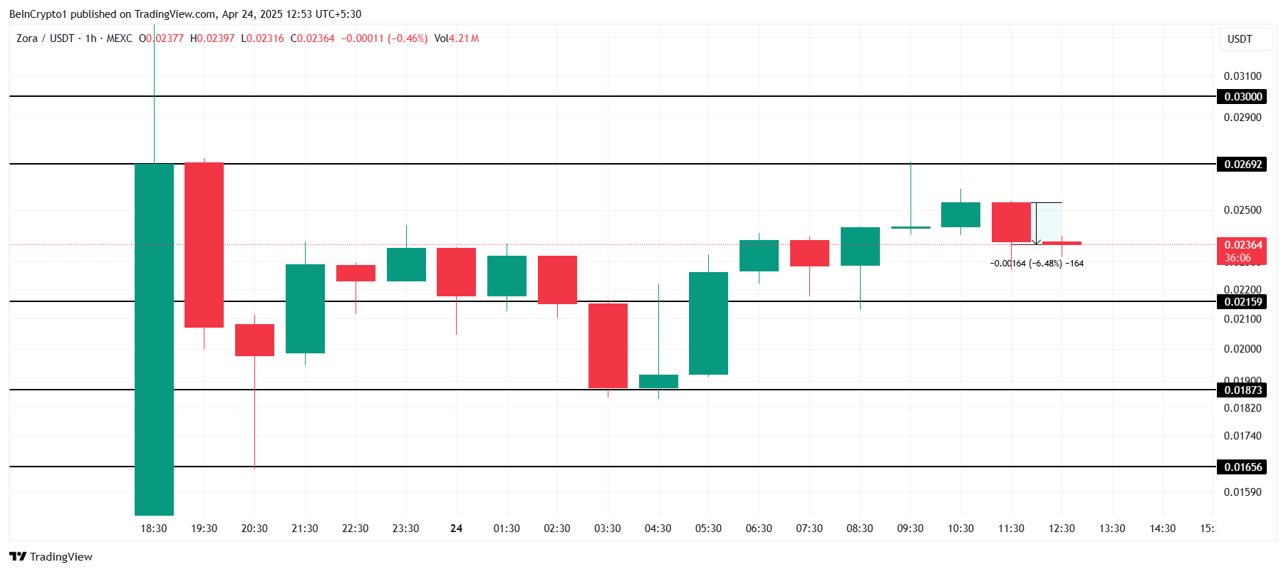 ณ เวลาที่เขียนบทความนี้ ราคาของ ZORA อยู่ที่ USD0.023 ซึ่งสะท้อนถึงการลดลง 6% ในชั่วโมงที่ผ่านมา ผู้ให้บริการ content coin กำลังติดอยู่ระหว่างแนวต้านที่ USD0.0269 และแนวรับที่ USD0.0215
