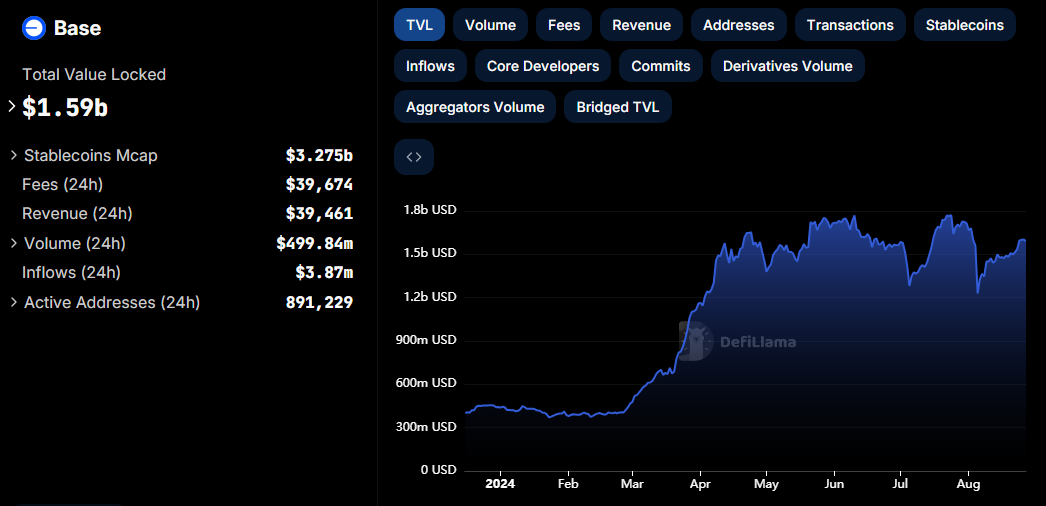 จากข้อมูลของ DeFiLlama มูลค่ารวมที่ถูกล็อค (TVL) บนห่วงโซ่ Base สูงถึง 1.59 พันล้านดอลลาร์ ซึ่งเพิ่มขึ้นเกือบ 30% จากระดับต่ําสุดรายเดือน TVL ที่เพิ่มขึ้นนี้สะท้อนให้เห็นถึงความนิยมที่เพิ่มขึ้น ซึ่งบ่งชี้ว่ามีเงินทุนมากขึ้นที่ถูกล็อคในระบบนิเวศ DeFi บน Base