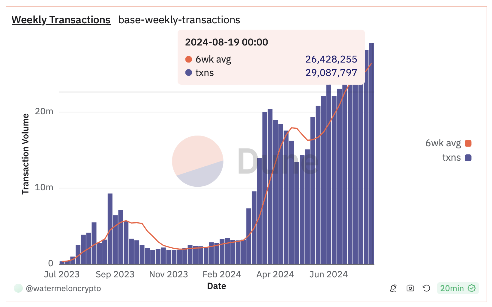นอกเหนือจากที่อยู่ที่ใช้งานอยู่เกินหนึ่งล้านที่อยู่ต่อวันแล้ว Base L2 ยังเห็นธุรกรรมรายวันพุ่งสูงขึ้นเกินสี่ล้านรายการ ข้อมูลจาก Dune Analytics เผยให้เห็นเพิ่มเติมว่าธุรกรรมรายสัปดาห์แตะระดับสูงสุดเป็นประวัติการณ์ เกิน 29 ล้านรายการ
