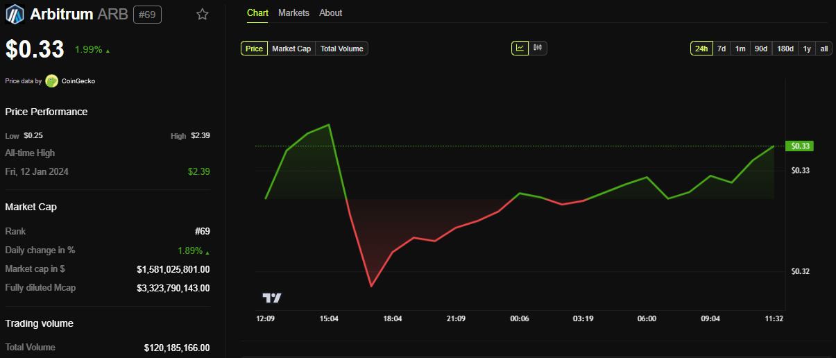 ข้อมูลจาก BeInCrypto แสดงให้เห็นว่าราคาของ ARB ของ Arbitrum เพิ่มขึ้น 2% ใน 24 ชั่วโมงที่ผ่านมา ขณะที่เขียนนี้ มันมีการซื้อขายที่ USD 0.33