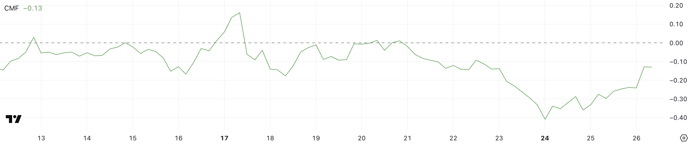 Chaikin Money Flow (CMF) วัดค่าเฉลี่ยของการสะสมและการกระจายที่ถ่วงน้ำหนักด้วยปริมาณในช่วงเวลาที่กำหนด โดยทั่วไปคือ 20 หรือ 21 วัน มันแกว่งระหว่าง -1 และ +1 โดยค่าบวกบ่งบอกถึง แรงซื้อและการสะสม ในทางกลับกัน ค่าลบแสดงถึงแรงขายและการกระจาย