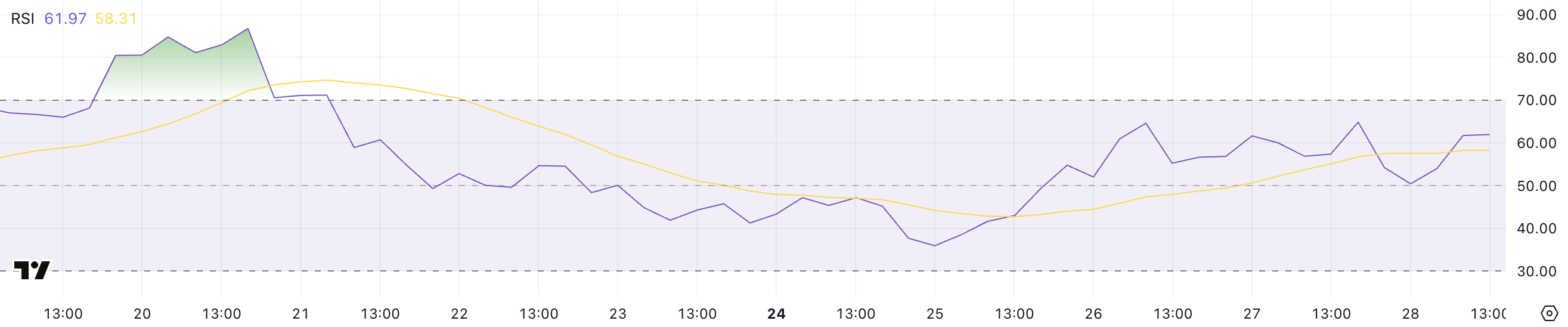 RSI ที่สูงกว่า 70 บ่งชี้ถึงสภาวะซื้อมากเกินไป ซึ่งอาจมีการดึงกลับ ขณะที่ RSI ต่ำกว่า 30 บ่งชี้ถึงสภาวะขายมากเกินไป ซึ่งอาจมีการฟื้นตัว RSI ระหว่าง 30 ถึง 70 โดยทั่วไปถือว่าเป็นกลาง สะท้อนถึงการไม่มีอคติทิศทางที่แข็งแกร่ง