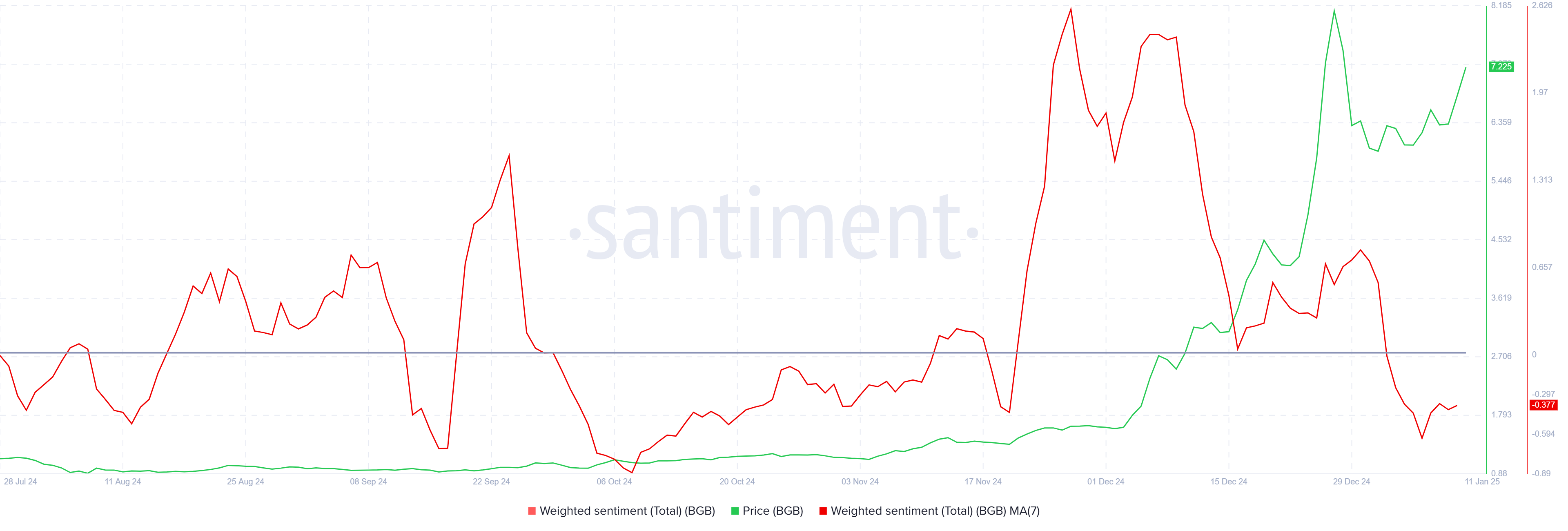 ความรู้สึกในตลาดเกี่ยวกับ BGB ได้เปลี่ยนเป็นเชิงลบเป็นครั้งแรกตั้งแต่กลางเดือนพฤศจิกายน ส่งสัญญาณความระมัดระวังในหมู่นักลงทุน ความรู้สึกที่ถ่วงน้ำหนัก ซึ่งเป็นตัวชี้วัดสำคัญ แสดงถึงความสงสัยที่เพิ่มขึ้นเนื่องจากผู้ค้าหลายคนตั้งคำถามถึงความยั่งยืนของการฟื้นตัวของ BGB ความเชิงลบนี้เกิดขึ้นหลังจากการปรับฐานในเดือนธันวาคม ซึ่งส่งผลกระทบต่อความเชื่อมั่นในหมู่ผู้ถือครอง