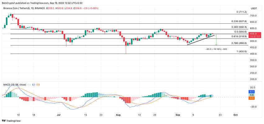 หากแรงซื้อยังคงดำเนินต่อไป BNB อาจพุ่งขึ้นไปที่ระดับต้านทานที่ 592.30 USD การทะลุผ่านระดับนี้จะนำ coin ไปสู่เป้าหมายที่ 637.80 USD