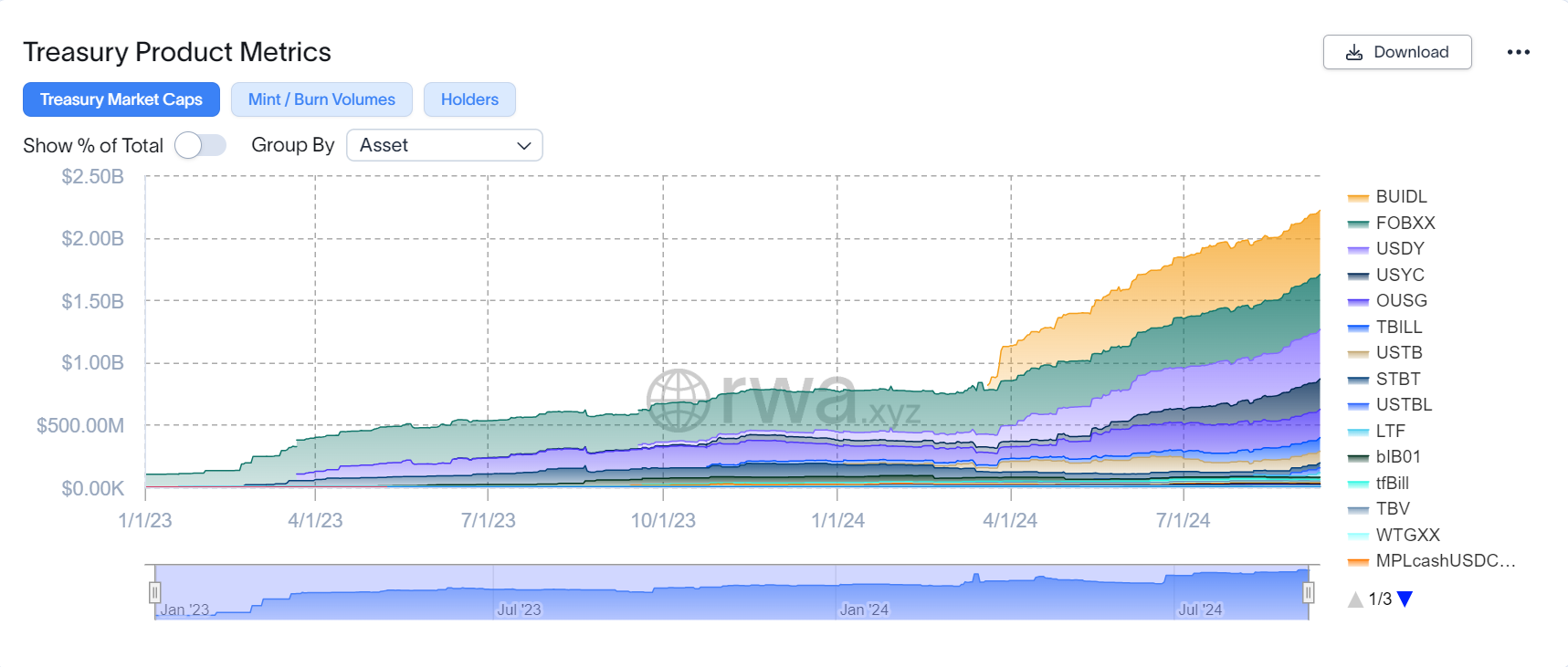 ในตลาดที่กว้างขึ้น ผู้เล่นหลักอื่นๆ รวมถึง Franklin Templeton และ BlackRock ก็ได้สำรวจโซลูชันการทำให้เป็น Token ของกระทรวงการคลัง. ข้อมูลจาก RWA.xyz เปิดเผยว่าภายในเดือนกันยายน 2024 มูลค่ารวมของสินทรัพย์เหล่านี้จะได้ถึง 2.22 พันล้านดอลลาร์ การเพิ่มขึ้นของมูลค่านี้เน้นย้ำถึงความน่าสนใจที่เพิ่มขึ้นของนักลงทุนส่วนตัวและสถาบัน ซึ่งให้ความสำคัญกับความมั่นคงและการปฏิบัติตามกฎระเบียบของ T-Bills ของสหรัฐ ทำให้เป็นตัวเลือกที่ต้องการสำหรับการทำให้เป็น Token