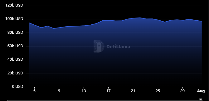 ข้อมูลของ DefiLlama แสดงให้เห็นว่าพื้นที่การเงินแบบกระจายอํานาจ (DeFi) พุ่งขึ้น 3.5% ในเดือนกรกฎาคม สูงสุดที่ 99.93 พันล้านดอลลาร์ กราฟ DeFi Total Value locked (TVL) นั้นคล้ายกับกราฟที่แสดงมูลค่าหลักทรัพย์ตามราคาตลาดของคริปโต