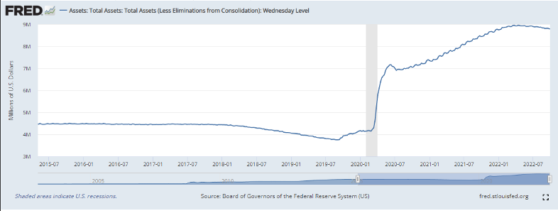 Federal Reserve เริ่มลดยอดเงินคงเหลือจาก 8.96 ล้านล้านดอลลาร์ในเดือนเมษายน 2565 เหลือ 8.79 ล้านล้านดอลลาร์ในขณะนี้ ซึ่งแตกต่างเพียง 2%