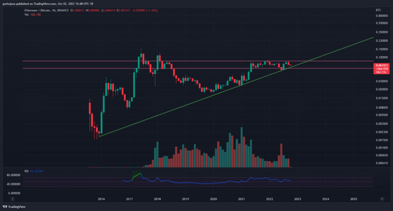 แผนภูมิอัตราส่วน Ethereum/Bitcoin รายเดือนแสดงให้เห็นว่า ETH สูญเสียฐานที่สำคัญต่อ BTC แม้ว่าจะมีการอัพเกรดการผสานครั้งประวัติศาสตร์ของ Ethereum เมื่อเดือนที่แล้ว น่าสนใจที่จะดูว่าราคา ETH ยังคงขึ้นบนชาร์ตรายเดือนควบคู่ไปกับยุคใหม่ของการออกหุ้นที่ลดลงหรือไม่