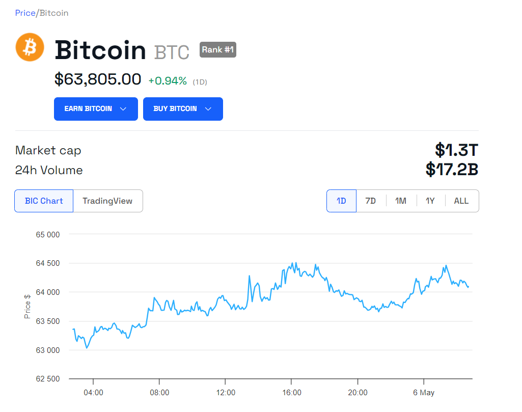 ท่ามกลางเหตุการณ์สําคัญครั้งใหม่ประสิทธิภาพของตลาดของ Bitcoin ยังคงดึงดูดความสนใจ ในขณะที่เขียน Bitcoin ซื้อขายที่ 63,805 ดอลลาร์ เพิ่มขึ้น 0.94% ในช่วง 24 ชั่วโมงที่ผ่านมา การเพิ่มขึ้นล่าสุดนี้เกิดขึ้นหลังจากการ ไต่ระดับจากต่ํากว่าเกณฑ์ 60,000 ดอลลาร์ ซึ่งได้รับแรงหนุนจากรายงานแรงงานของสหรัฐฯ ที่ดีเมื่อวันศุกร์ก่อนหน้า