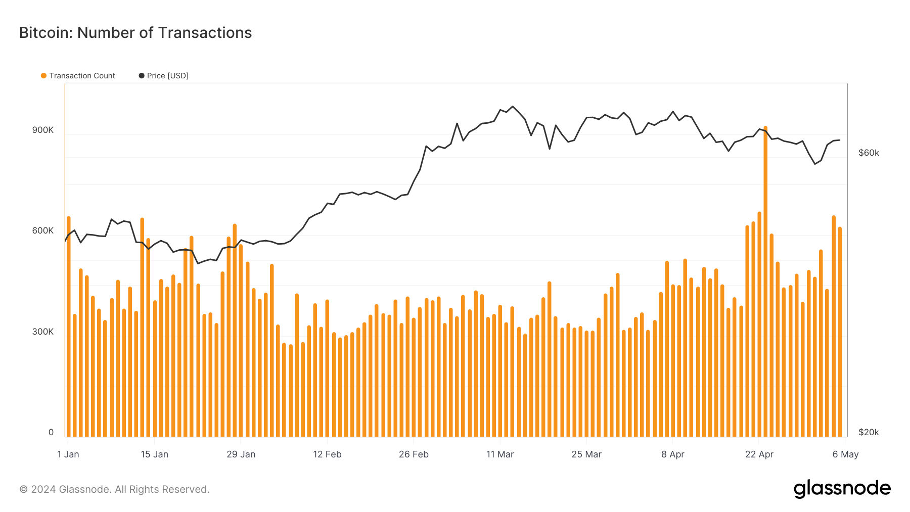 ข้อมูลล่าสุดของ Glassnode ชี้ให้เห็นว่าวันที่ 23 เมษายนเป็นวันที่มีธุรกรรม Bitcoin สูงสุดในปี 2024 จนถึงตอนนี้ ในวันนั้น มีการบันทึกธุรกรรม 926,842 รายการเมื่อ Bitcoin มีราคาอยู่ที่ 66,403 ดอลลาร์ อย่างไรก็ตาม จํานวนธุรกรรมจากวันก่อนหน้าคือ 625,859 โดยมีราคาของ Bitcoin อยู่ที่ประมาณ 64,000 ดอลลาร์