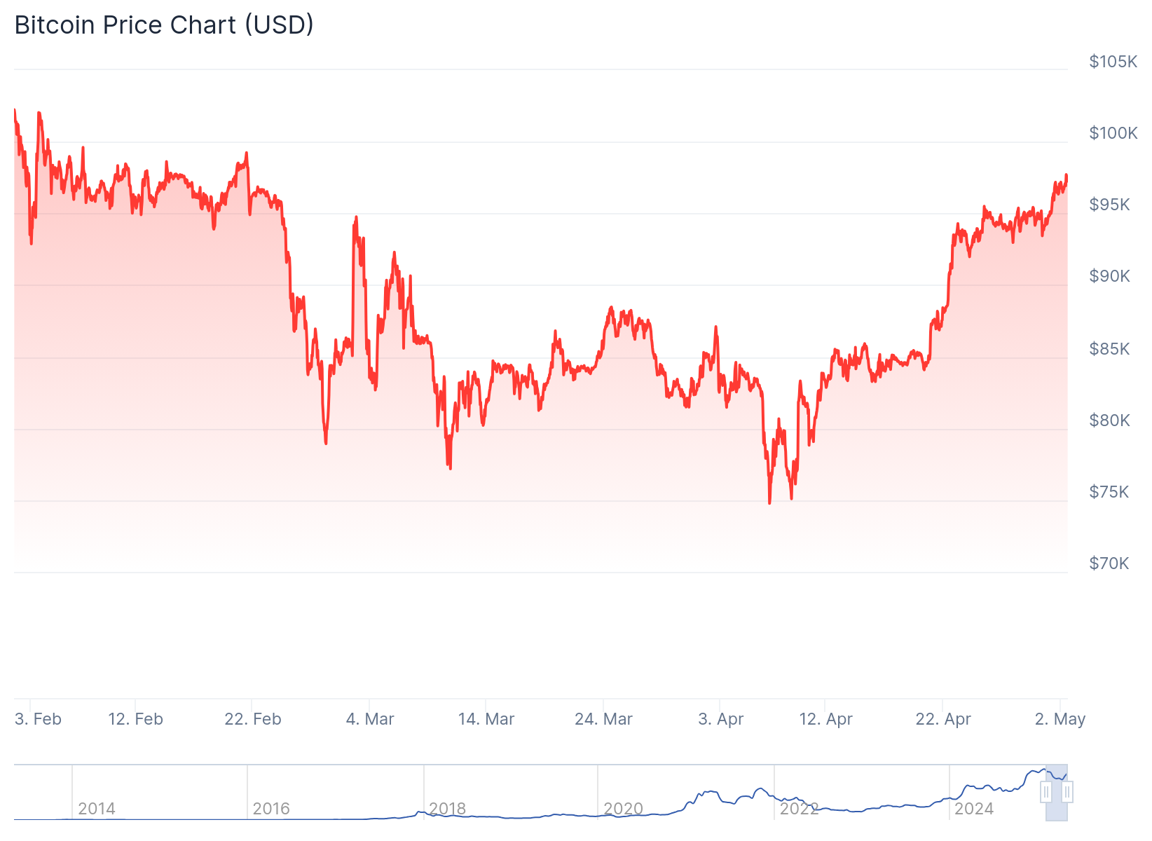 ในขณะที่เขียนบทความนี้ ราคาของ Bitcoin อยู่ต่ำกว่า USD 98,000 เล็กน้อย เมื่อมันเติบโตขึ้น นักเทรดต่างเฝ้ารอให้มันข้ามจุด USD 100,000 เมื่อมันเกิดขึ้น จะเป็นครั้งที่สองในประวัติศาสตร์คริปโตที่เกิดเหตุการณ์นี้