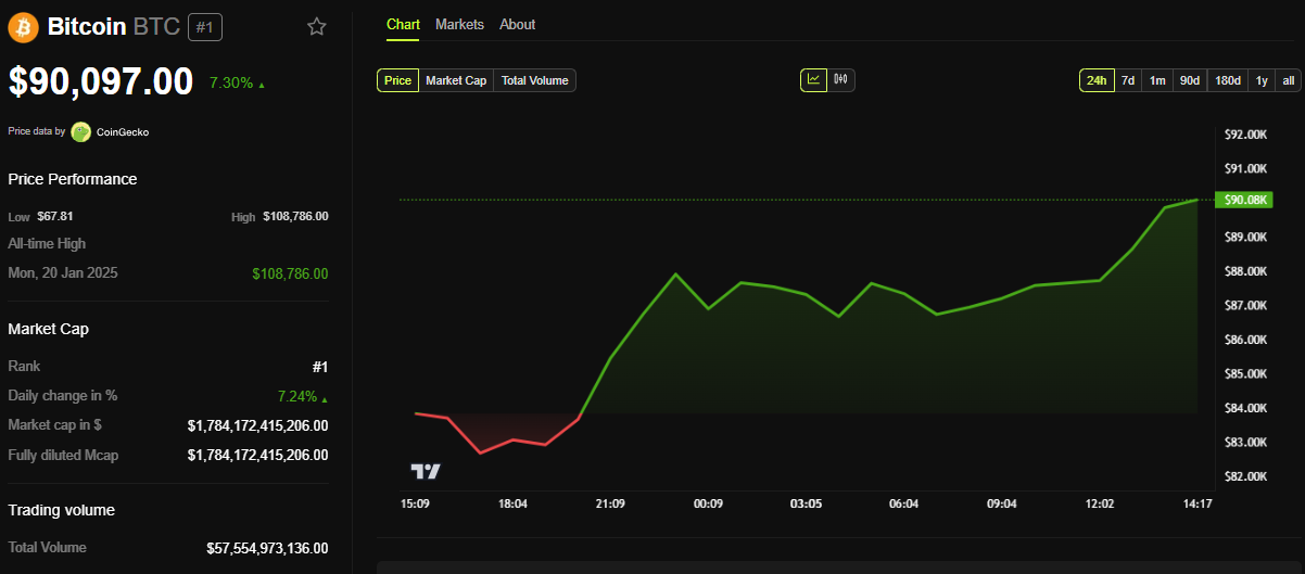 หลังจากข่าวนี้ Bitcoin กลับมาที่ระดับจิตวิทยา 90,000 USD โดย BTC ซื้อขายที่ 90,097 USD ณ ขณะที่เขียนนี้ ตามข้อมูลจาก BeInCrypto ข้อมูล นี้แสดงถึงการเพิ่มขึ้นกว่า 7% ตั้งแต่เปิดการซื้อขายในวันพุธ
