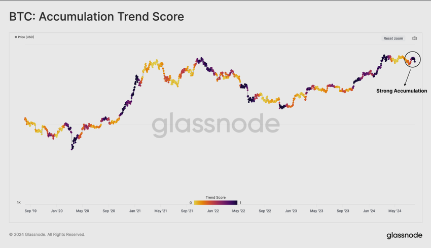 นับตั้งแต่ Bitcoin แตะระดับสูงสุดเป็นประวัติการณ์ในเดือนมีนาคม ตลาดก็ประสบกับการกระจายอุปทานเป็นเวลานาน อย่างไรก็ตาม แนวโน้มนี้ดูเหมือนจะย้อนกลับ โดยเฉพาะอย่างยิ่งในกระเป๋าเงินที่ใหญ่ที่สุด คะแนนแนวโน้มการสะสม (ATS) สนับสนุนการสังเกตนี้ โดยแสดงให้เห็นถึงการกลับสู่พฤติกรรมที่โดดเด่นในการสะสมด้วยค่าสูงสุดที่เป็นไปได้ที่ 1.0 ในเดือนที่ผ่านมา