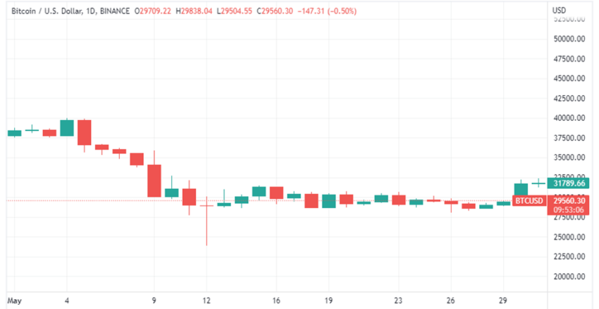 BTC เปิดมาที่ราคา 37,713 ดอลลาร์สหรัฐฯ เมื่อวันที่ 1 พฤษภาคม มีราคาสูงที่สุดในเดือน หรืออยู่ที่ 39,789 ดอลลาร์สหรัฐฯ ลดลงต่ำสุดในเดือนหรืออยู่ที่ 26,350 ดอลลาร์สหรัฐฯ เมื่อวันที่ 12 พฤษภาคม และปิดเดือนด้วยราคาซื้อขายที่ 31,792 ดอลลาร์สหรัฐฯ