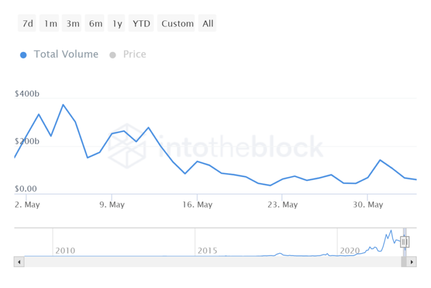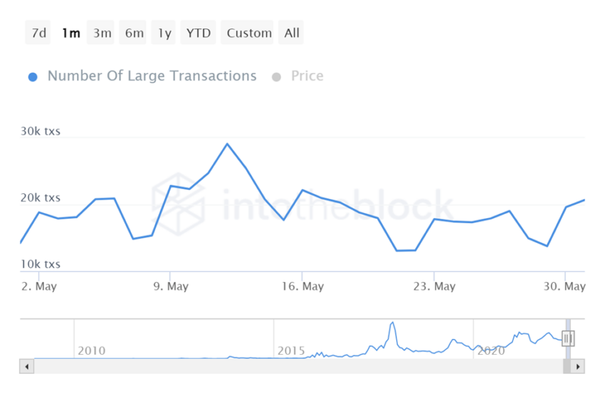 ในเดือนพฤษภาคม จำนวนธุรกรรมขนาดใหญ่เกี่ยวกับBitcoinที่สูงที่สุด สูงถึง 29,130 ธุรกรรม ซึ่งมีราคาอยู่ที่ 27,960 ดอลลาร์สหรัฐฯ ในวันที่ 12 พฤษภาคม