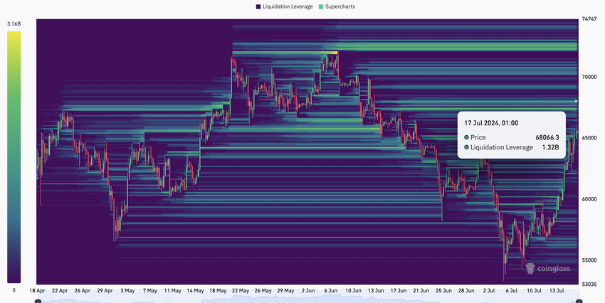 หากสภาพคล่องกระจุกตัวอยู่ในพื้นที่ใดพื้นที่หนึ่ง ราคา crypto มีแนวโน้มที่จะเคลื่อนตัวไปยังภูมิภาคนั้น จากข้อมูลที่ได้รับจาก Coinglass ราคาของ Bitcoin อาจเข้าใกล้ 67,469 ดอลลาร์ และ 68,000 ดอลลาร์
