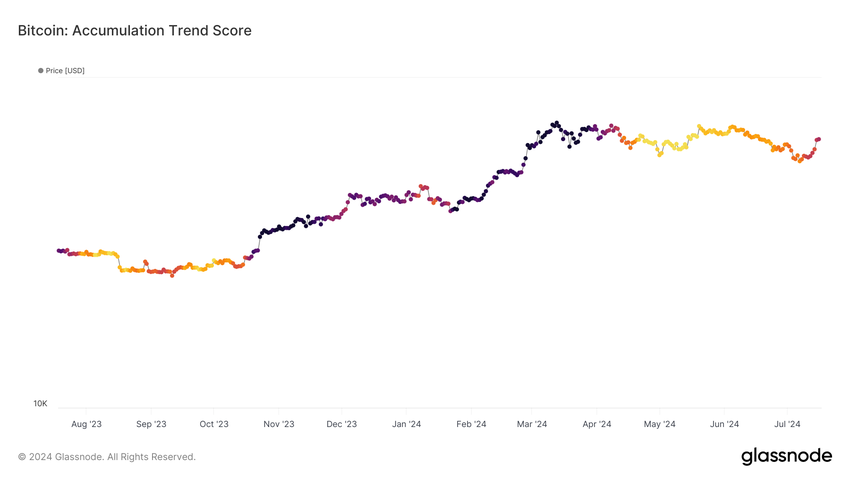 จากมุมมองแบบ on-chain คะแนนแนวโน้มการสะสมแสดงให้เห็นว่า Bitcoin ได้ออกจากขั้นตอนการกระจายแล้ว คะแนนแนวโน้มมีตั้งแต่ 0 ถึง 1 ซึ่งให้ข้อมูลเชิงลึกเกี่ยวกับพฤติกรรมของหน่วยงานขนาดใหญ่ของตลาด