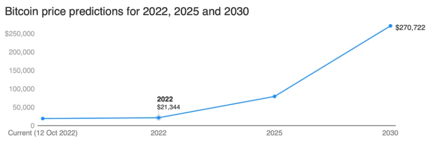 “คณะกรรมการของเราคิดว่า Bitcoin (BTC) จะมีมูลค่า 21,344 ดอลลาร์ภายในสิ้นปี 2565 ก่อนที่จะเพิ่มขึ้นเป็น 79,193 ดอลลาร์สหรัฐภายในปี 2025”